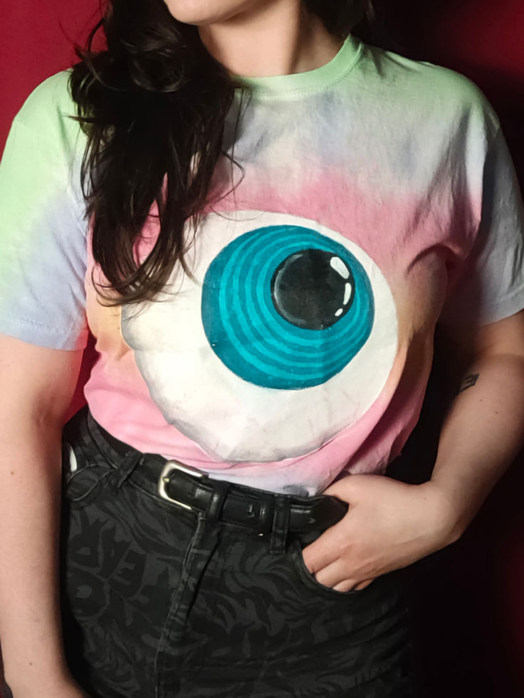 This t-shirt has a multicolour pastel tie-dye pattern with a large hand-painted disembodied eyeball on the front. The eye is white with grey shading, featuring an iris with rings of different shades of, and a black pupil with white highlights to emphasise light reflecting off of surface of a human eye. The eye covers a large portion of the front of the top, and together with the tie-dye pattern, has a psychedelic style.